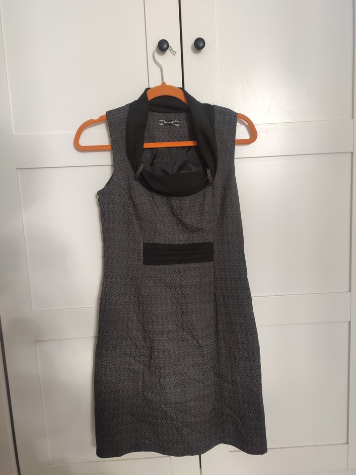 Kolsuz, yüksek yakalı ve kemerli bel detaylı gri desenli elbise. Ofis kullanımı için uygun, vücuda oturan kesime sahiptir.