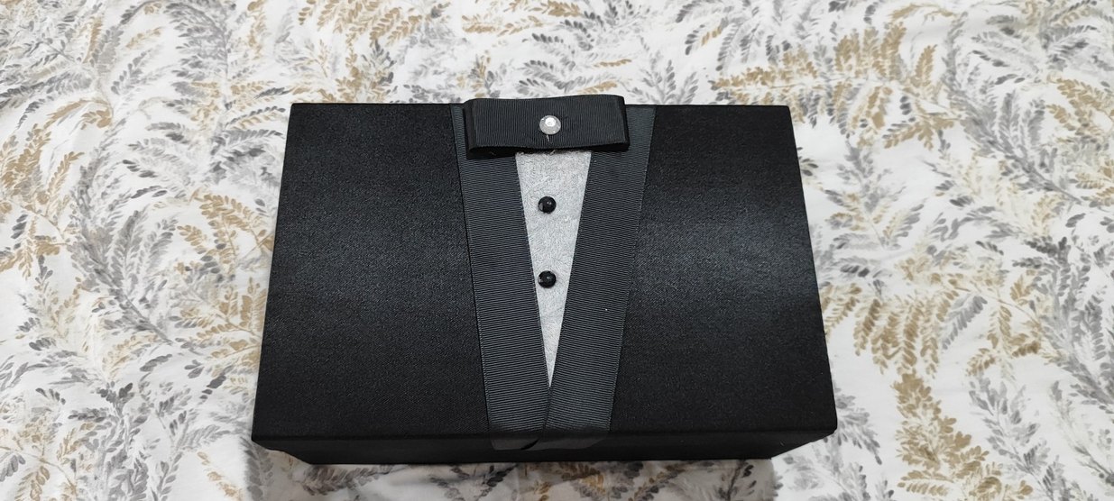 Uzun siyah tuxedo, gri desenli ön yüzü, kuşaklı bel kısmı, askılı kolları ve kesik yaka detayıyla avant-garde düğünler için uygun.