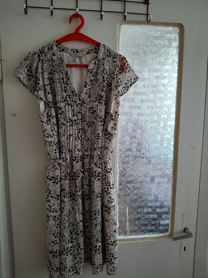 Gri desenli, V yakalı ve pile detaylı, salaş kesim midi boy kolsuz elbise. Yumuşak sentetik kumaştan, bohem ve retro tarzı bir arada sunar.