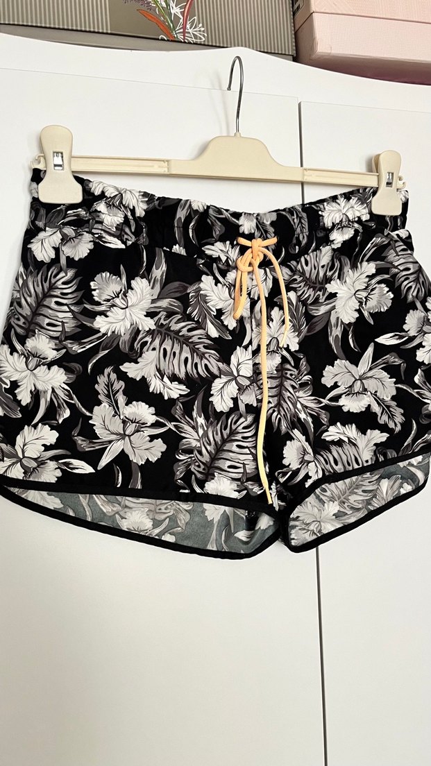 Gri renkli, desenli deniz midi şort. Sentetik kumaştan, rahat ve bol kesim.