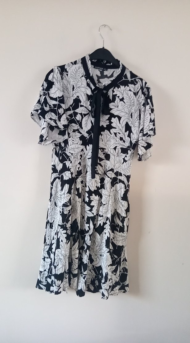 Gri desenli, kısa kollu, drapeli, gevşek kesim midi elbise. Bohem ve retro tarzları yansıtır. kolları ve etek uçları volanlı iki koltuk altı arası 46 cm omuzdan aşağıya doğru 98 cm