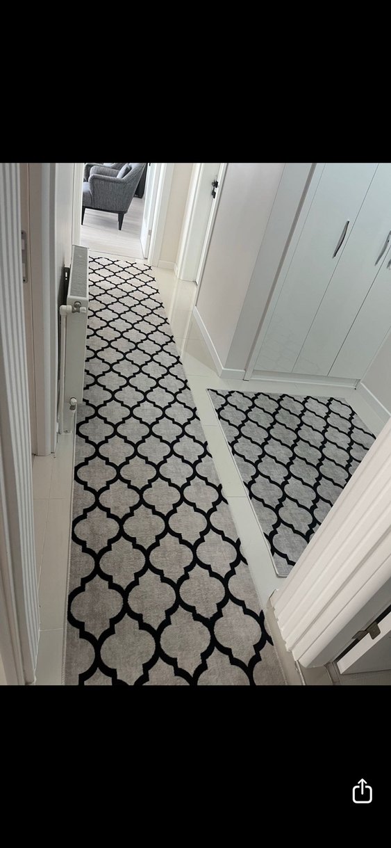 Gri tonlarında desenli modern koridor halısı, dar alanlara şıklık katıyor. Uzun olan 80*510 Dıgerı 120 *150