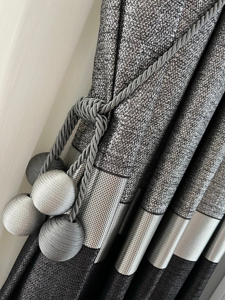 Taşınıyorum acil satılık Desenli dokusu ve büyük yuvarlak püsküllü bağlama ipleriyle gri modern perdeler, her odaya şık bir dokunuş katar.
