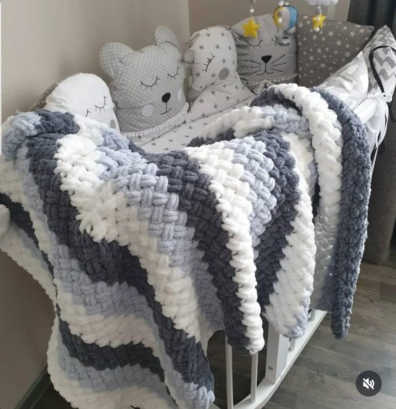 Gri tonlarında desenli örgüden yapılmış çocuk battaniyesi, yumuşak ve rahat bir dokunuş sunar.