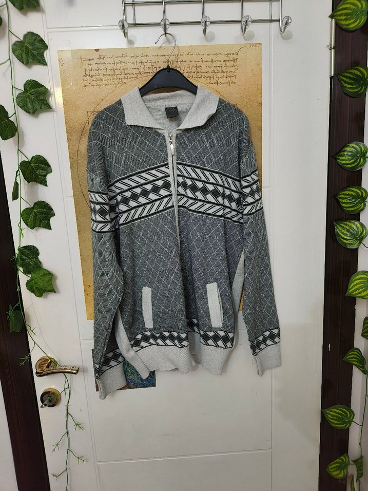 Gri renkte, desenli örgü erkek hırka. Yüksek yakalı, uzun kollu ve fermuarlı tasarıma sahip, rahat kesimdir. Günlük kullanıma uygundur. Omuz genişliği 53 uzunluğu 68cm
