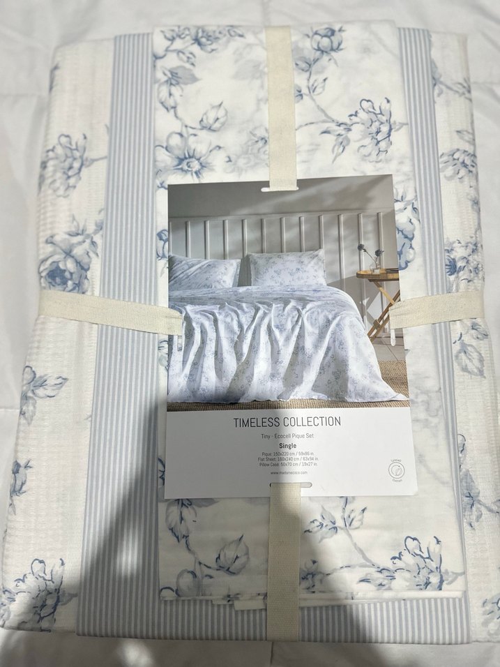 Mavi ve beyaz tonlarda çiçek desenli pamuklu pike takımı. Yumuşak ve rahat kumaştan üretilmiştir. TIMELESS COLLECTION serisine ait.