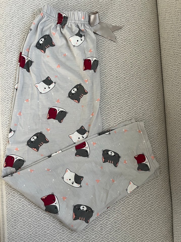 Gri renkli, desenli ve bol kesim kadın pijama altı, rahat elastik bel bandı ve yumuşak kumaş ile konfor sağlar.