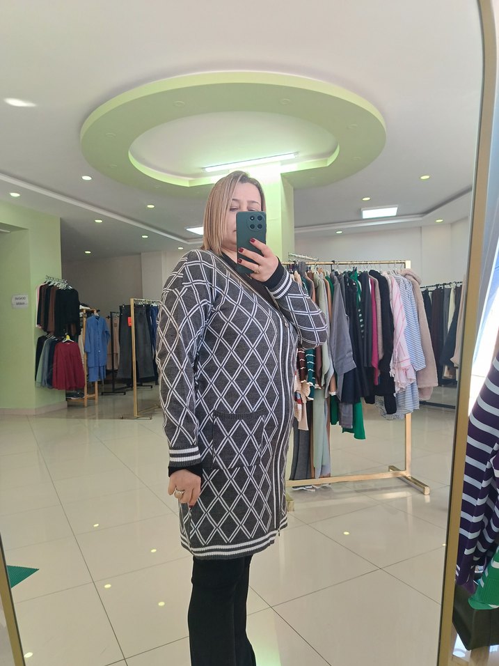 Gri renkte, yüksek yakalı ve uzun kollu örme salaş midi hırka. Tie-dye desenli, rahat ve sokak stiline uygun. Standart Beden