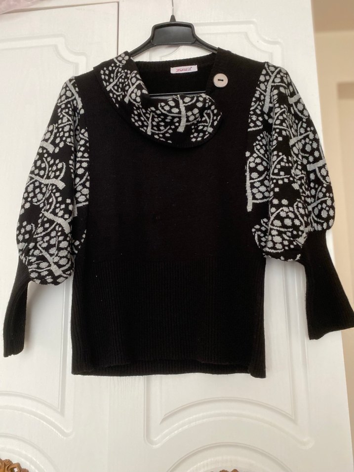 Siyah örgü kumaştan, rahat kesim uzun kollu ve yuvarlak yakalı kadın kazak. Gri desenli kollara ve uyumlu boğaz kısmına sahiptir, gündelik kullanıma uygundur.