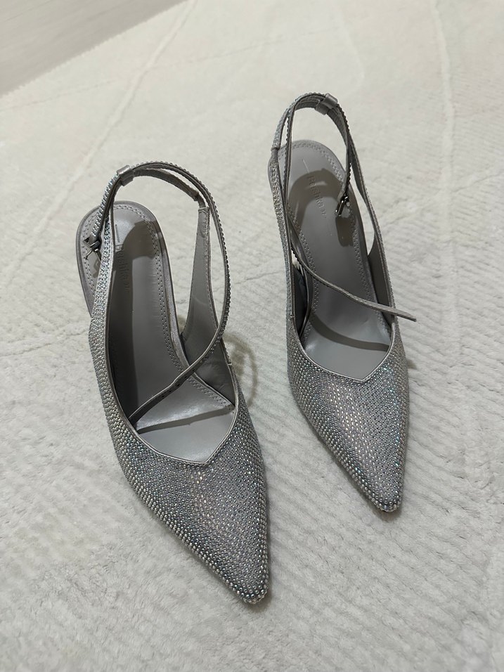 Gri desenli, taşlı metal malzemeden yapılmış stiletto topuklu abiye ayakkabılar. Düğün gibi özel akşam etkinlikleri için modern ve şık tasarım.