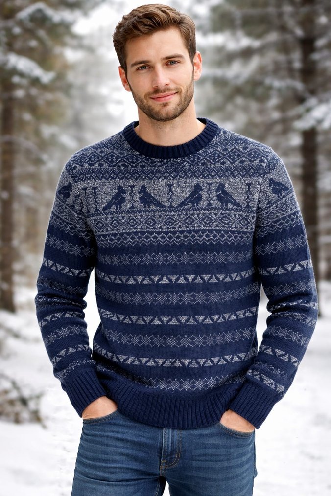Yuvarlak yaka ve uzun kollu, örgüden üretilmiş bol kesim gri desenli erkek kazak. Günlük rahat kullanıma uygundur.