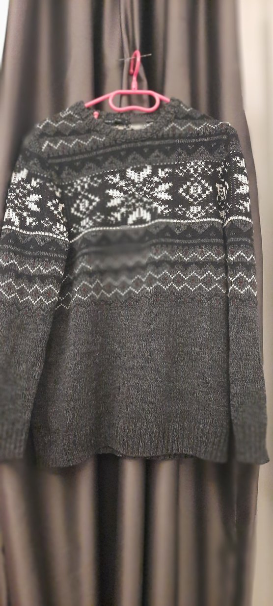 Gri renkli, desenli triko kazak, yuvarlak yaka ve uzun kolludur. Rahat kesimi ve normal boyu ile günlük kullanıma uygundur.