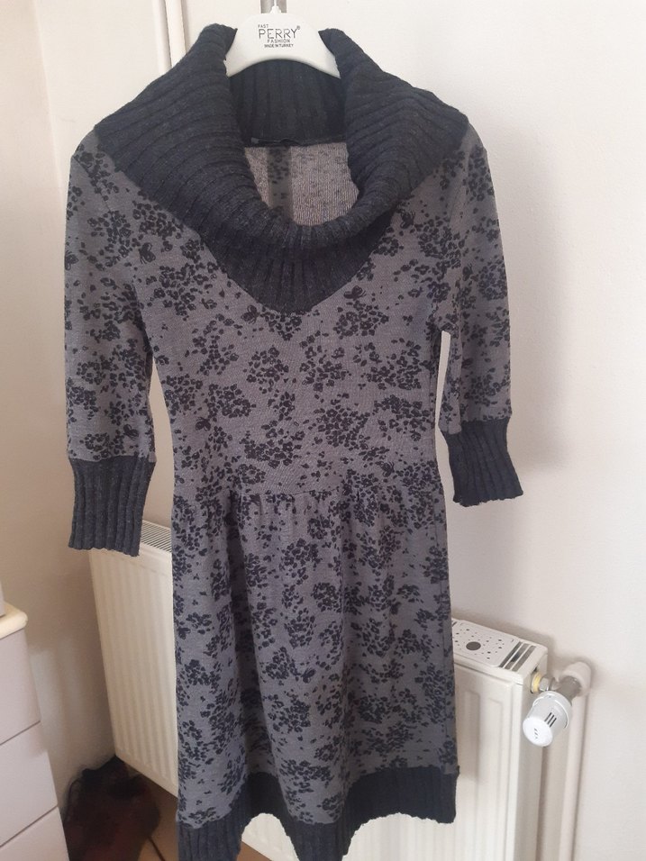 Yüksek yakalı, uzun kollu, gri desenli triko elbise, rahat ve vücuda oturan kesimiyle günlük kullanım için uygundur.