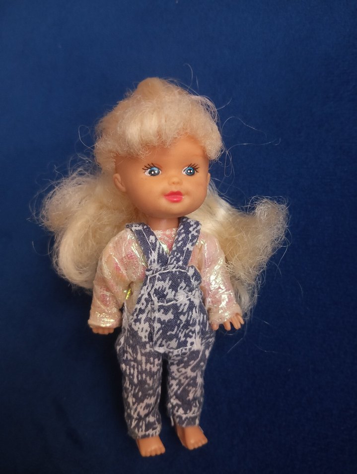 Sarı saçlı, pastel gri desenli tulum ve açık pembe uzun kollu üst giymiş küçük oyuncak bebek. Canlı mavi gözleri ve yumuşak yüz ifadesi bulunur.