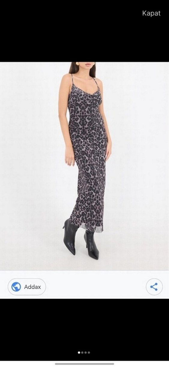 Drapeli, askılı, fitted kesim uzun elbise, koyu gri yılan desenli, romantik akşamlar için uygun.