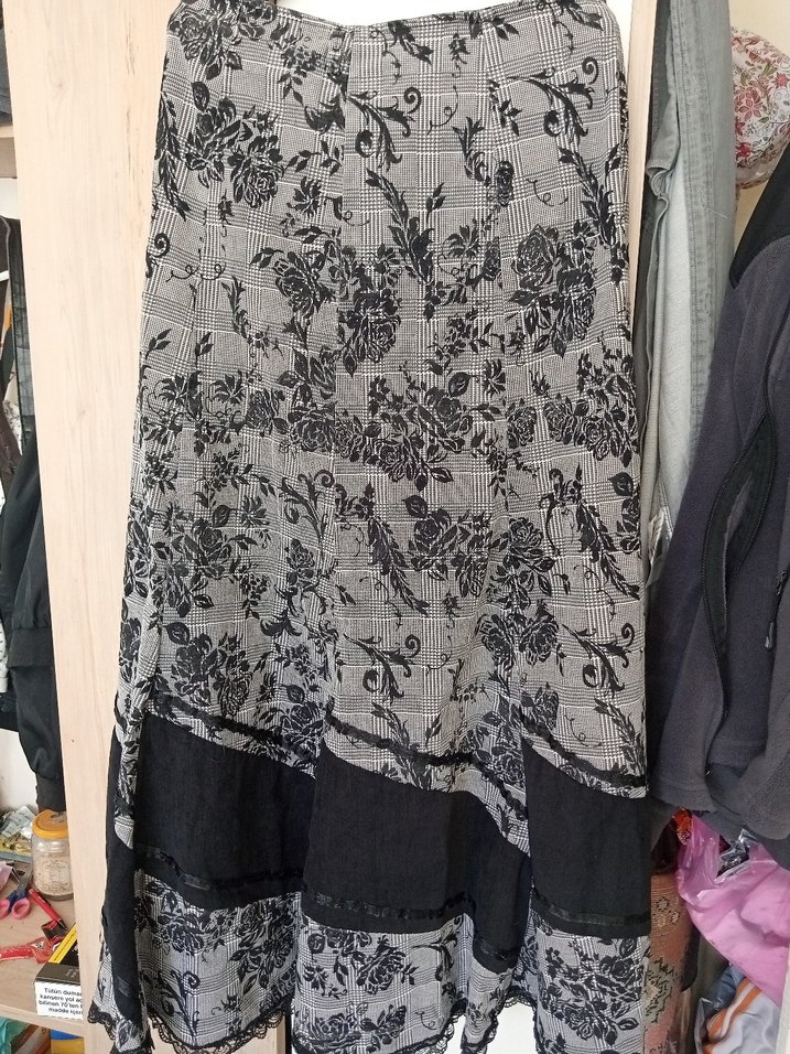 Gri renkte, desenli ve dökümlü uzun etek, bol kesimiyle bohem tarzı yansıtıyor.