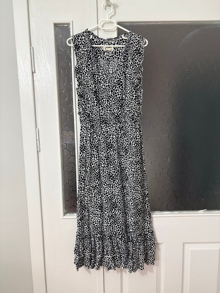 Kolsuz, bol kesim ve V yakalı bu bohem elbise, uzun boy ve fırfır detaylarıyla gri yılan desenine sahiptir. Yumuşak sentetik kumaştan üretilmiştir. İhraç fazlası olduğu için etiketi kesilmiş.