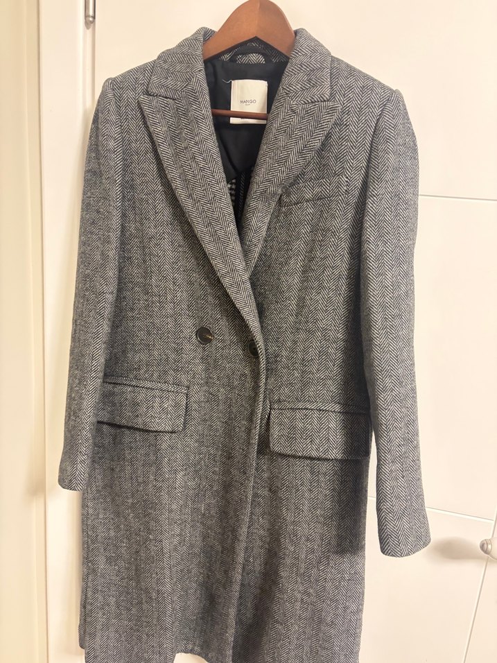 Klasik yakalı, düğmeli kapama ve ön cepleri olan gri balıksırtı desenli. Diz boyda