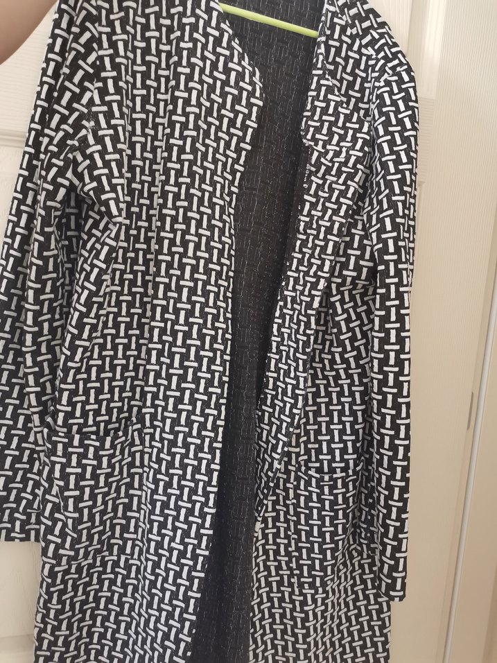 Gri-siyah geometrik desenli, örgü dokulu uzun kadın kaban. Notlu yaka ve uzun kollu, rahat kesim sokak stiline uygun.