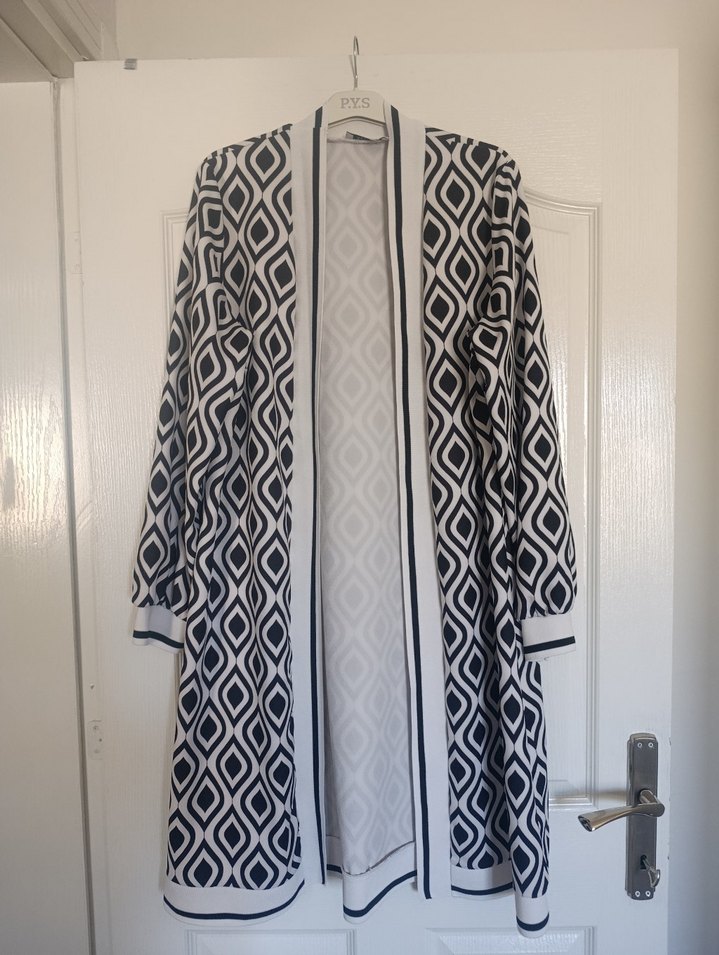 Kadınlar için uzun, bol kesim ve uzun kollu kimono. Drapeli tasarım ve yakasında kesik detay bulunur. Gri desenli kumaşıyla modern Paris tarzını yansıtır. Günlük kullanım için uygundur. 44/46 bedene uygun