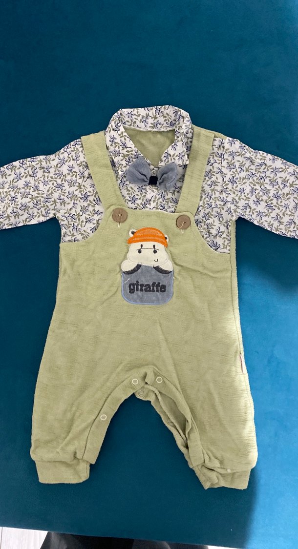 Uzun kollu, yumuşak ve sıcak kumaştan yapılmış, desenli bebek tulumu. Düğmeli ve askısız yakalı, sevimli zürafa desenli. Sokak stili için uygun.