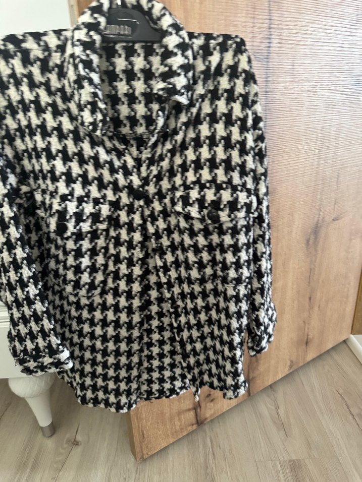 Gri desenli kadın gömlek, bol kesim, uzun kollu ve kesimli yakaya sahiptir. Düğmeli ön kısmı ve midi boyu ile gündelik sokak tarzına uygundur.