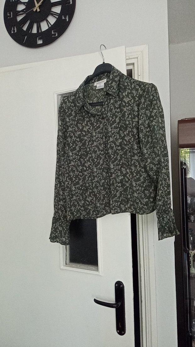 Gri renkli, desenli, uzun kollu ve düğmeli kısa kesim gömlek. Sentetik kumaştan, bol kesim ve yakalı, ofis kullanımı için uygun.