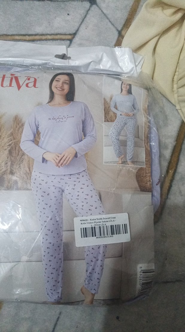 Gri renkli, uzun kollu ve desenli kadın pijama takımı. Rahat kesimi ve midi boyu ile konforlu bir uyku deneyimi sunar. Marka: tiva.