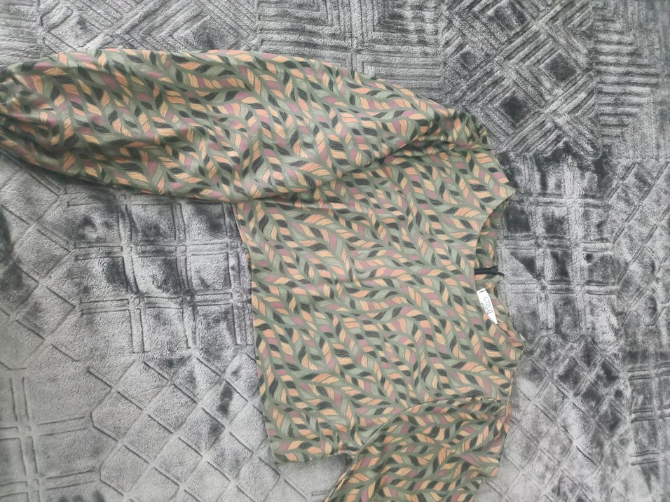 Gri desenli, uzun kollu, salaş kesim bluz. Drapeli tasarımı ve kayık yaka ile bohem tarzda, yumuşak sentetik kumaştan yapılmıştır.