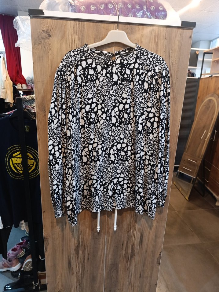 Uzun kollu, salaş kesim ve yuvarlak yaka bluz, zincir detaylıdır. Gri tie-dye desenli, normal midi boyda, yumuşak sentetik kumaştan üretilmiştir.