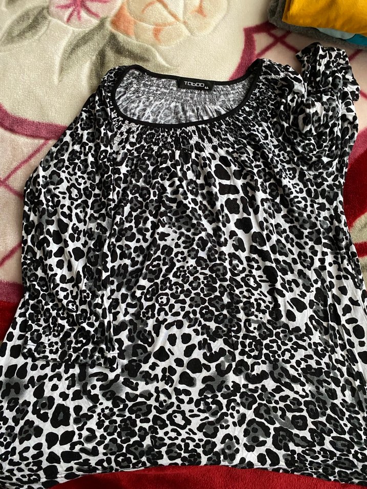 Gri, uzun kollu, salaş kesim ve kayık yaka detaylı, desenli ve kürk detaylı bluz. Yumuşak sentetik kumaştan, rahat ve şık.
