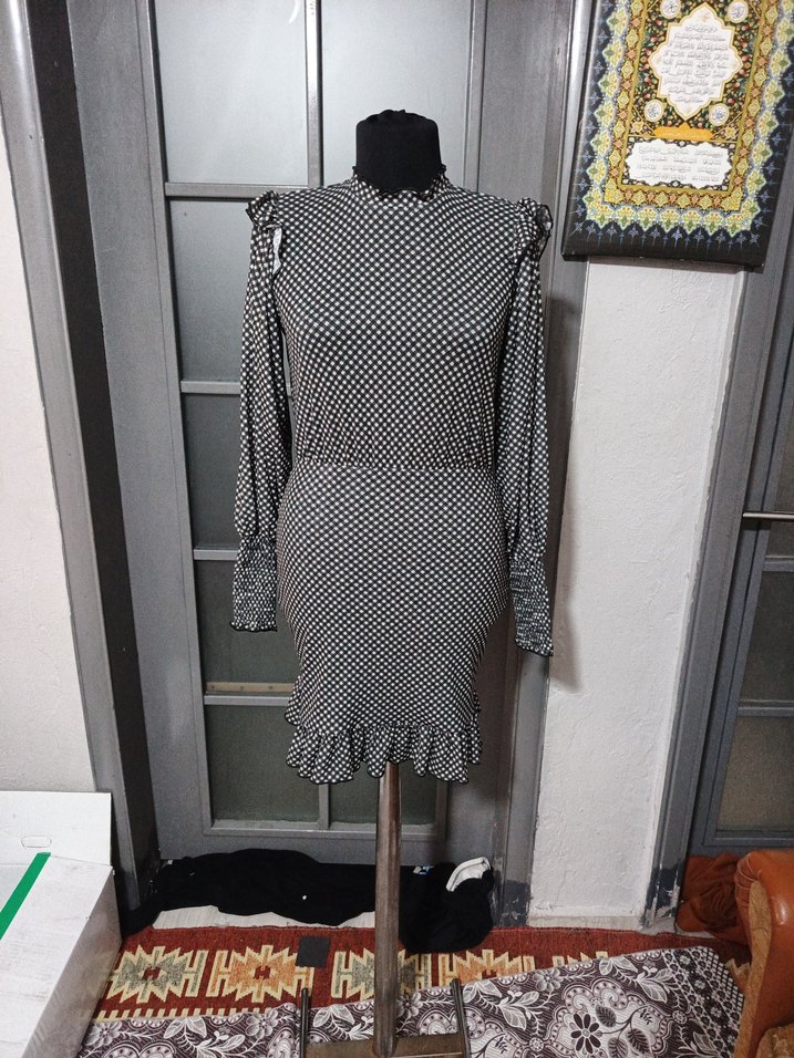 Gri desenli triko elbise, uzun kollu, yüksek yakalı ve omuz ile etek kısmında fırfırlı detaylara sahip. Midi boy ve regular fit kesimle modern ve Parisli tarzı birleştirir