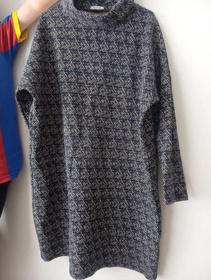 Gri renkli, desenli triko elbise. Yüksek yakalı, uzun kollu ve bol kesimdir. Rahat ve şık bir günlük tercih.