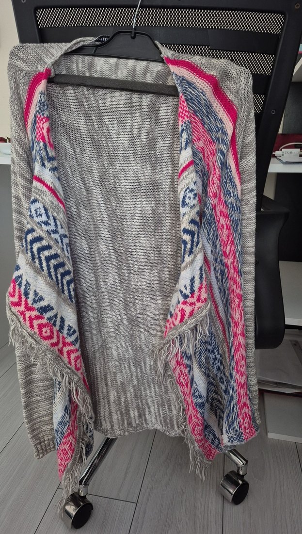 Gri, pembe ve mavi tonlarda desenli, uzun ve bol kesim örgü kadın hırkası. Uzun kollu ve V yaka, günlük kullanıma uygundur.