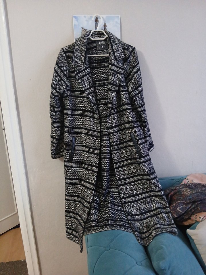 Gri desenli, uzun örgü kadın kaban, keskin yaka ve uzun kolludur. Rahat kesimi ve yumuşak sentetik kumaşıyla günlük sokak stiline uygundur.