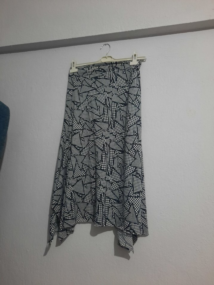 Geometrik siyah beyaz desenli, uzun ve salaş kesim kadın eteği. Yumuşak sentetik kumaştan, sokak stiline uygun günlük kullanım için ideal.