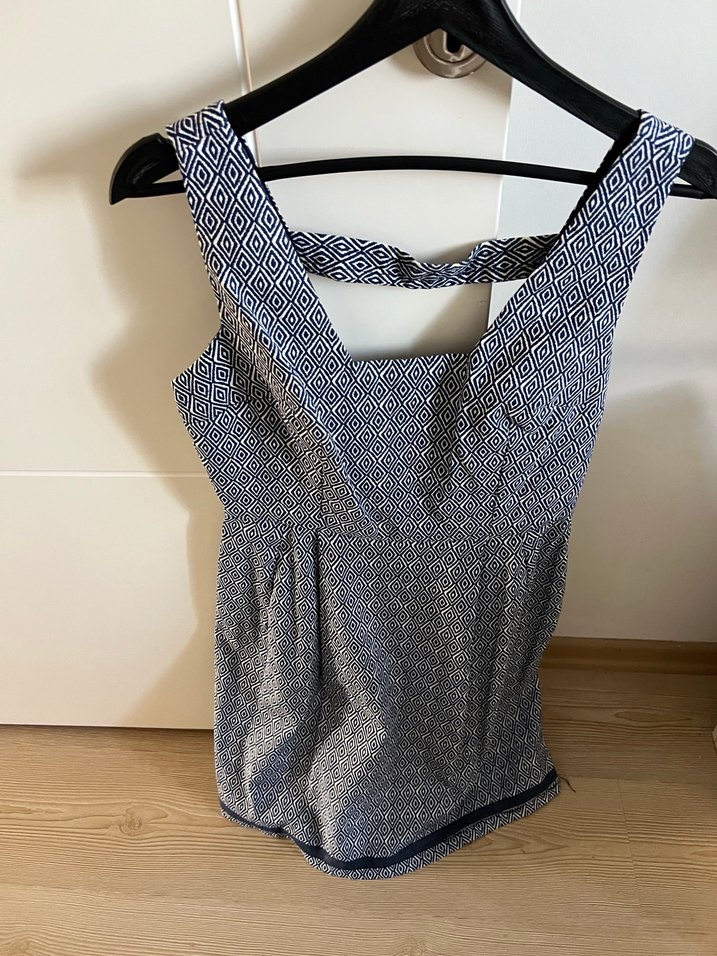 Gri geometrik desenli, kemerli ve V yaka, kolsuz mini bluz. Günlük kullanıma uygun, çağdaş tarza sahip.