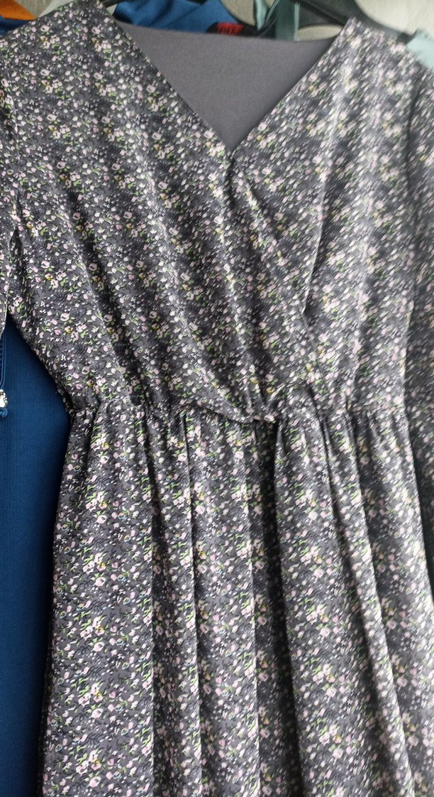 Gri renkli, V yakalı ve askılı uzun elbise. Salaş kesimi ve bağlama desenli kumaşıyla bohem tarzını yansıtıyor.