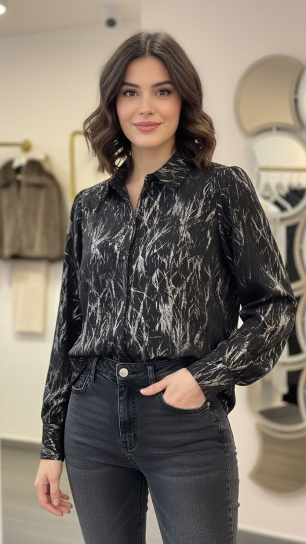Kadın gömlek, bol kesim, uzun kollu ve V yaka detaylıdır. Siyah zemin üzerine gri tie-dye desenli, düğmeli ön kapamalıdır. Sentetik, yumuşak kumaştan üretilmiştir, ofis ve sokak stiline uygun.
