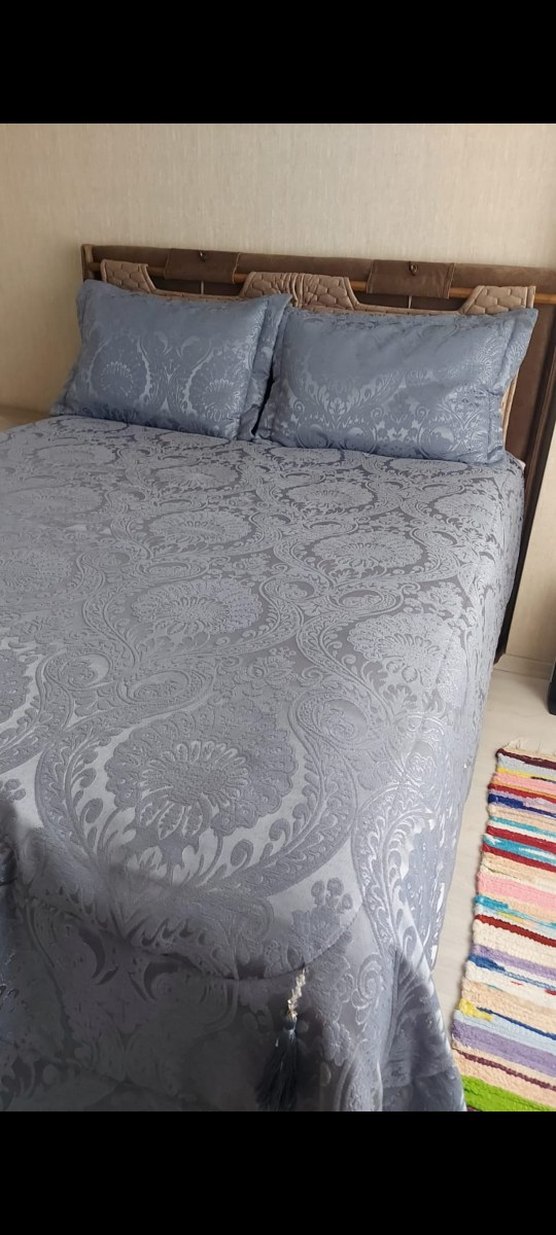 Gri renkli yatak örtüsü, detaylı desenlerle şık bir görünüm sunar. Aynı desende yastık kılıfları ile uyum sağlar. ️