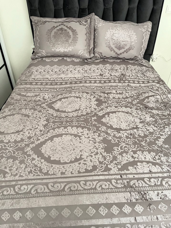 Gri renkli, desenli yatak örtüsü takımı, detaylı motiflere sahip ve uyumlu yastık kılıfları içerir. ️