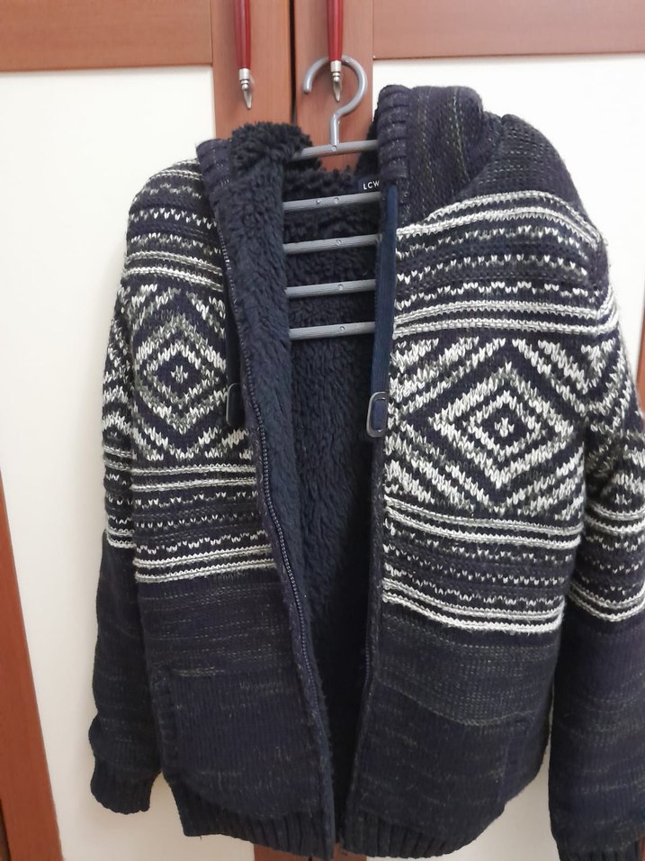 Gri renkli, desenli örgü erkek hırka. Yüksek yakalı, uzun kollu ve bol kesimdir. Normal midi boyda, rahat sokak stiline uygundur. kapüşonlu içi kürklü mont gibi sıcak tutuyor