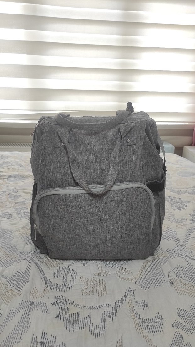 Gri renkte, desensiz ve çok bölmeli, kolay taşınabilir bebek çantası.