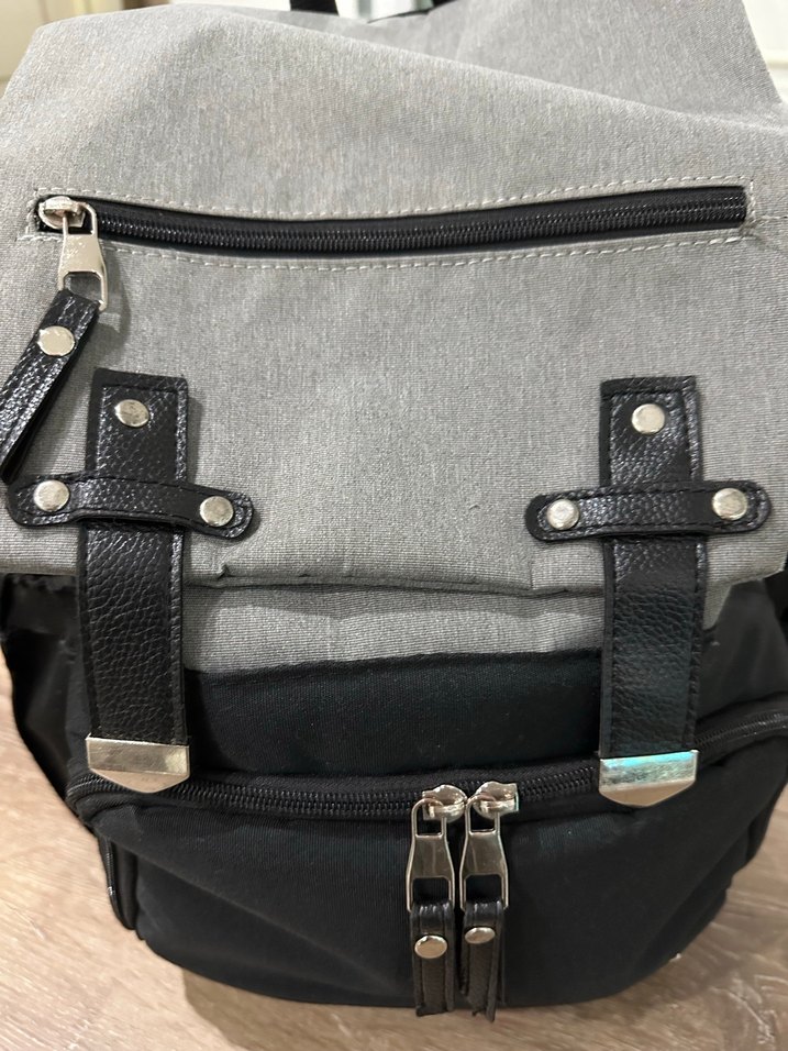 Gri renkte, desensiz tasarıma sahip bebe çantası, kolay taşıma için sağlam kulplara ve çoklu bölmelere sahiptir.