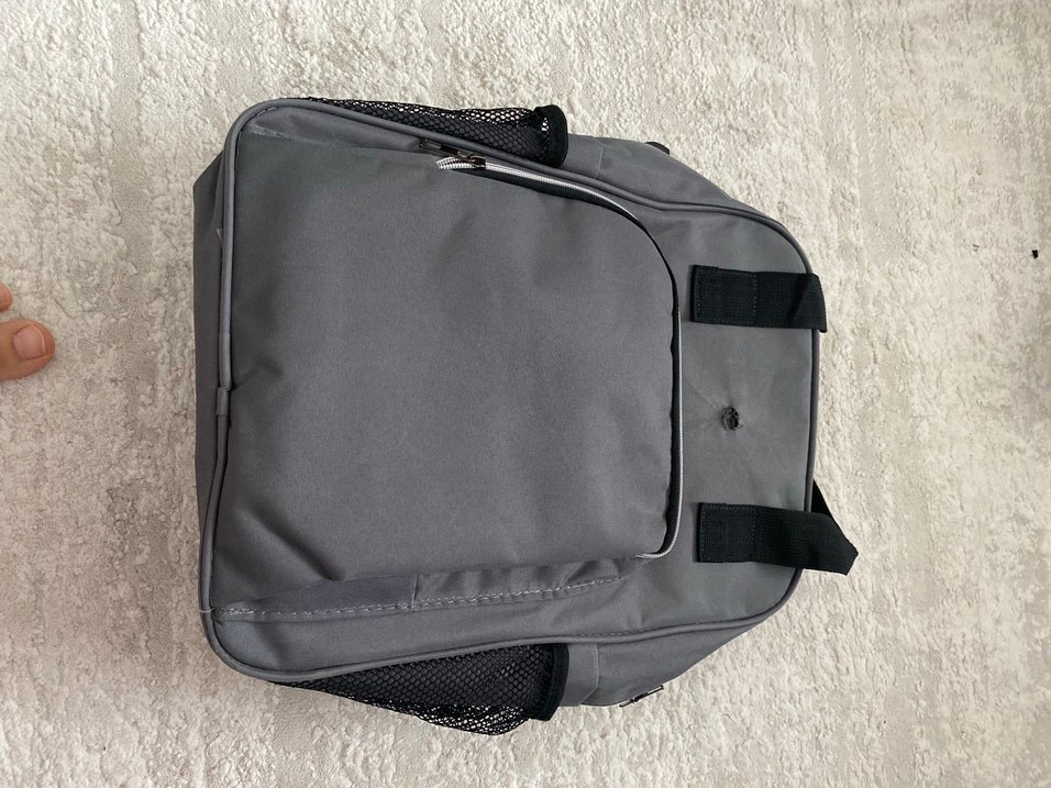 Çok bölmeli, yanlarda file cepleri bulunan gri, desensiz bebek çantası. Kolay düzenleme sağlar. Sadece ön tarafında küçük bir defosu var hiç kullanılmadı orda logo olduğundan dolayı cıkarırken öyle bi yırtık oluştu onun haricinde temiz