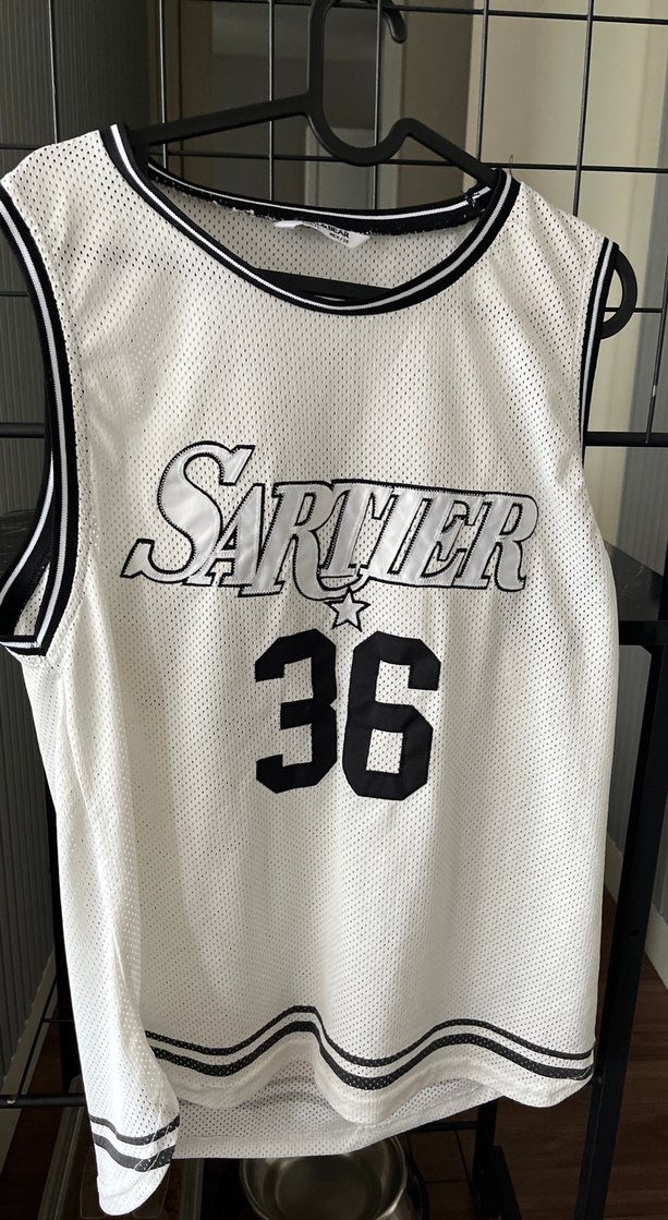 Beyaz renkli, 'SARTER' baskılı ve 36 numaralı, zincir detaylı, bol kesim erkek atlet jersey.