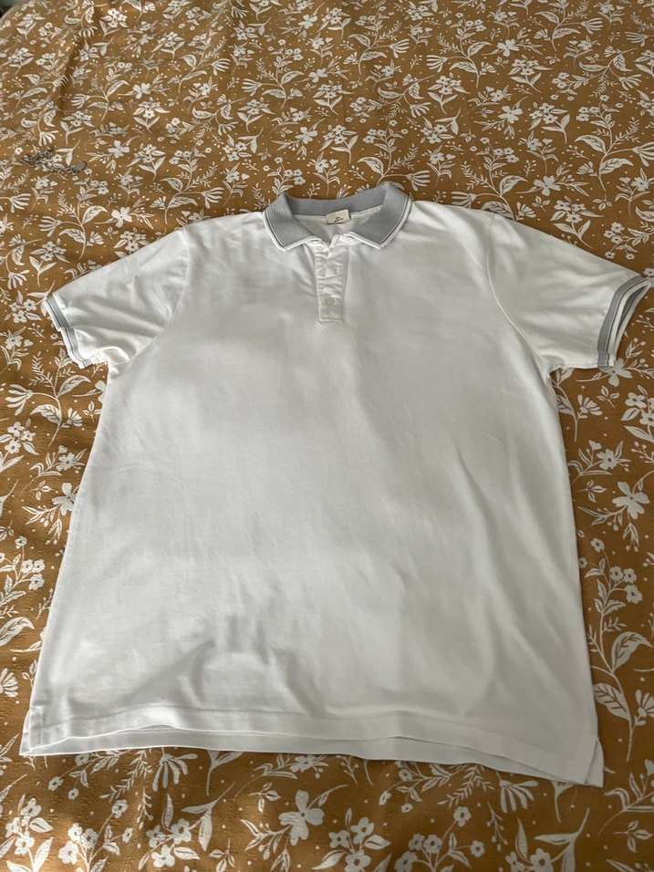 Gri detaylı yakası ve kısa kollu beyaz erkek polo tişört, pamuklu kumaştan, rahat kesim ve günlük kullanım için uygundur. Bir kez kullanıldı ve yıkandı . Dar geldiği için satıyorum