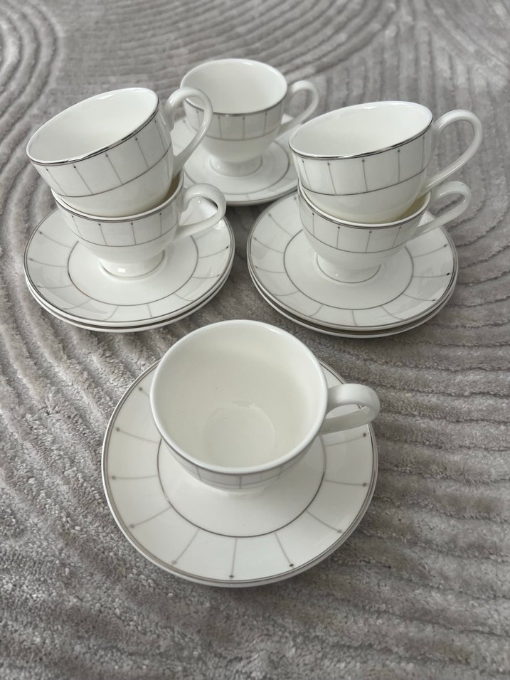 Gri çizgi detaylı beyaz fincan ve tabaklar, klasik ve şık bir masa takımı sunar. ☕
