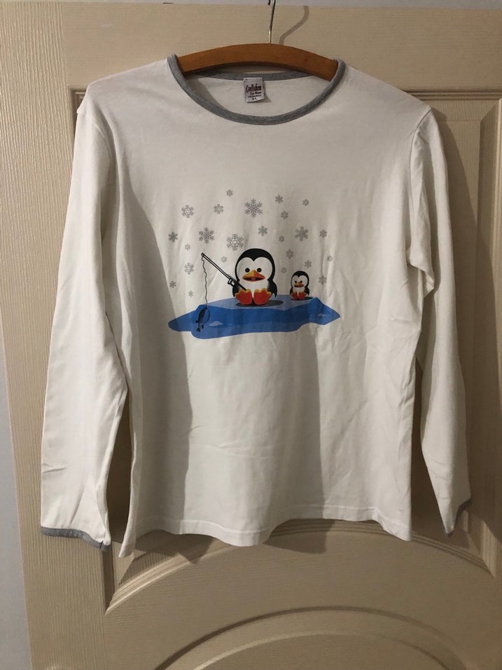 Gri detaylı beyaz, uzun kollu hamile tişörtü. Örme kumaştan, penguen ve kar tanesi baskılı, rahat kesim ve normal boyda. ❄️