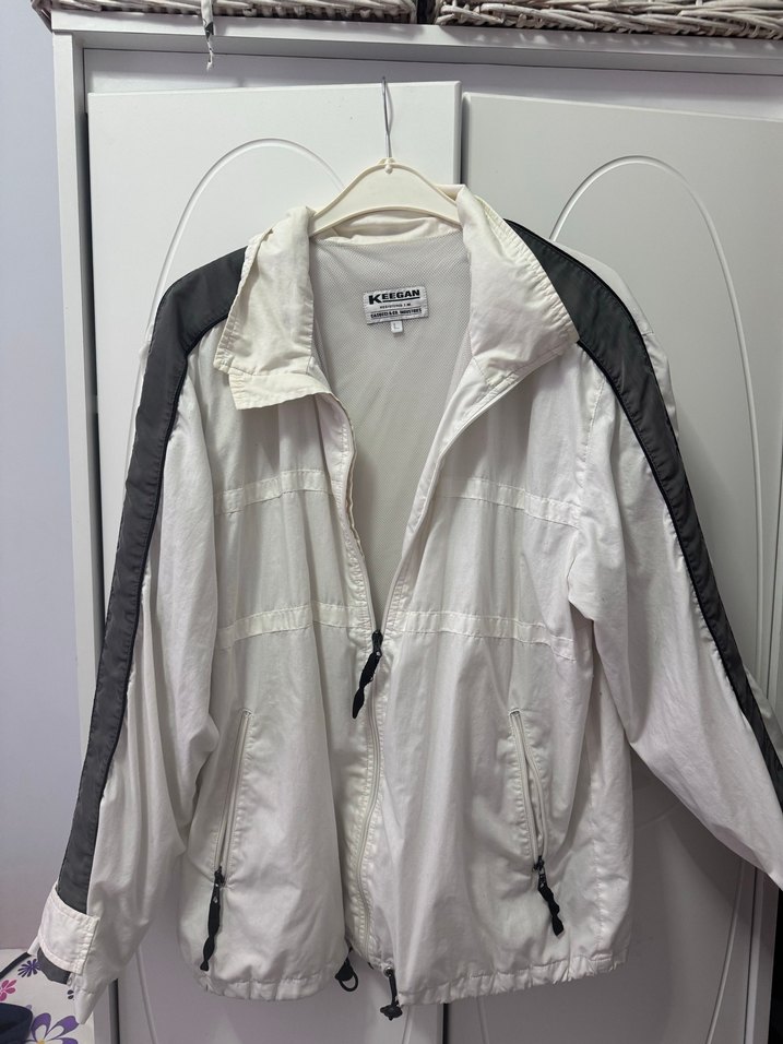 Gri şeritli beyaz kadın fermuarlı ceket, bol kesim, uzun kollu ve yakasında kesik detay bulunur. Fermuarlı ön ve yan ceplerle, hafif keten kumaştan üretilmiştir. Hafif rüzgarlık ceket